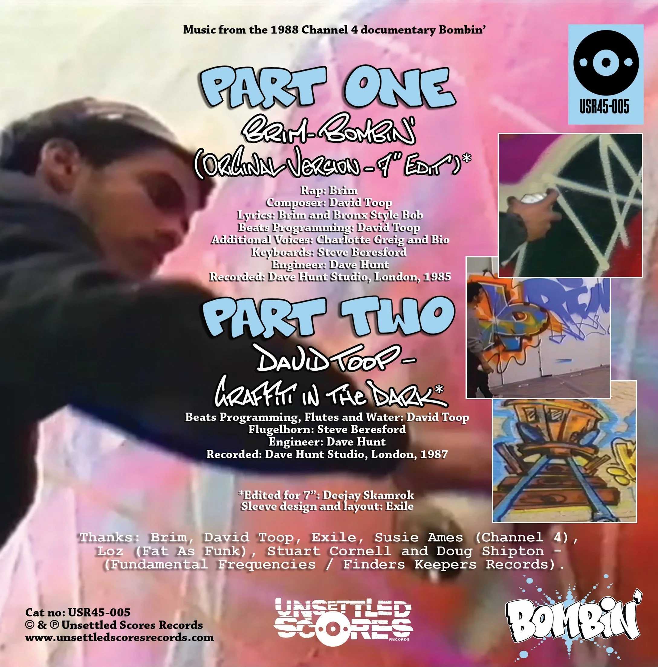 Bombin’ (Original Version – 7” Edit) by Brim and Graffiti In The Dark by David Toop were created for director Dick Fontaine’s seminal film, first broadcast on UK’s Channel 4 in early 1988.